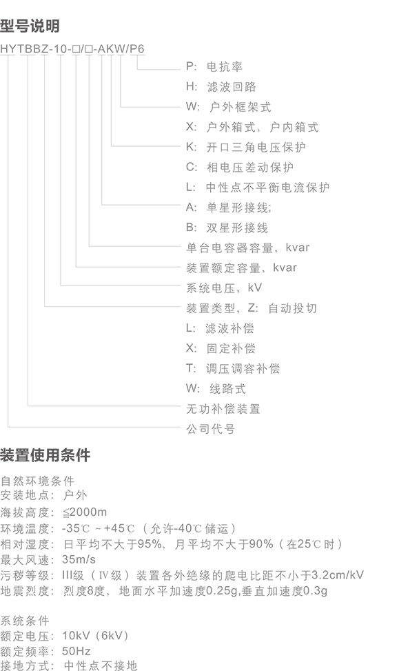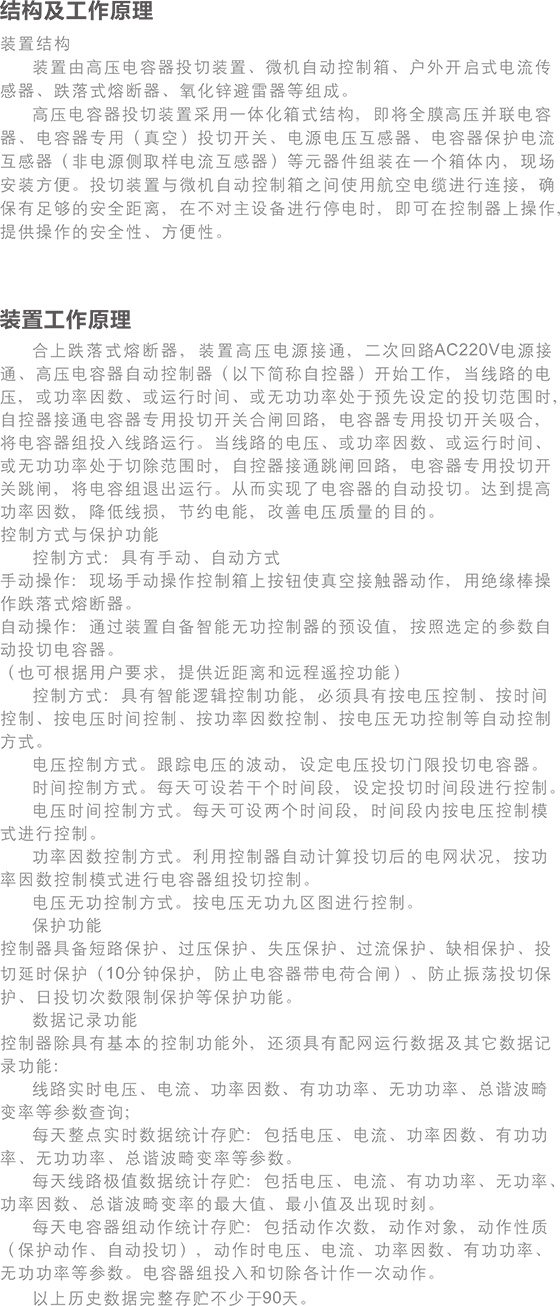 HYTBBW系列高壓線路無(wú)功補(bǔ)償智能裝置,主要適用在10kV(或6kV)配電線路上和用戶端,可安裝在架空線路線桿上,最高工作電壓12kV。作為提高功率因數(shù),降低線路損耗,節(jié)約電能,改善電壓質(zhì)量之用。實(shí)現(xiàn)對(duì)無(wú)功量的自動(dòng)補(bǔ)償,使電能質(zhì)量和補(bǔ)償數(shù)量達(dá)到最佳值。也可以用于小型化終端變電所10kV(或6kV)母線無(wú)功補(bǔ)償。