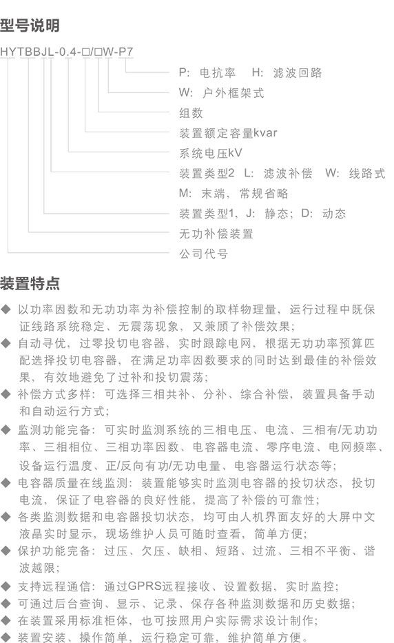 HYTBB低壓無功綜合補償裝置適用于配變、低壓線路,或其他的戶外低壓配電系統場合,實現無功自動跟蹤補償。裝置集無功補償優化和電力監測于一體,采用固定補償和動態補償相結合方式??蓪崟r跟蹤電網的運行狀態,具有平滑的補償性能,具有最優的補償效果。系統可有效補償線路無功功率,保證功率因數穩定,降低線路損耗,提高變壓器、傳輸線路的利用率,提高負載端的供電質量。