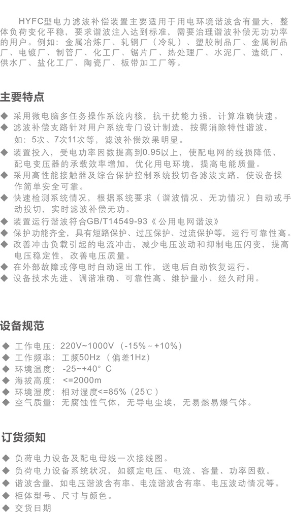 HYFC型電力濾波補償裝置是一種經濟型調諧濾波兼補償設備,由