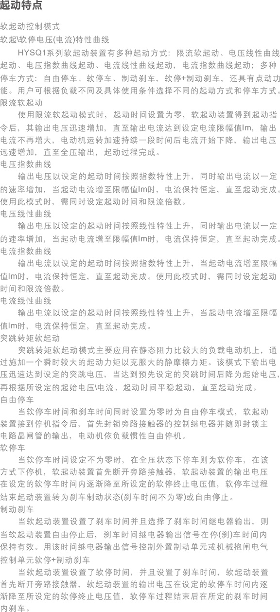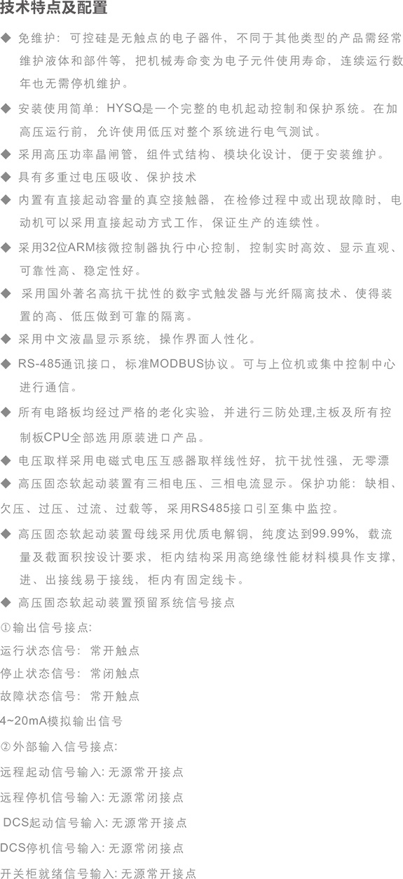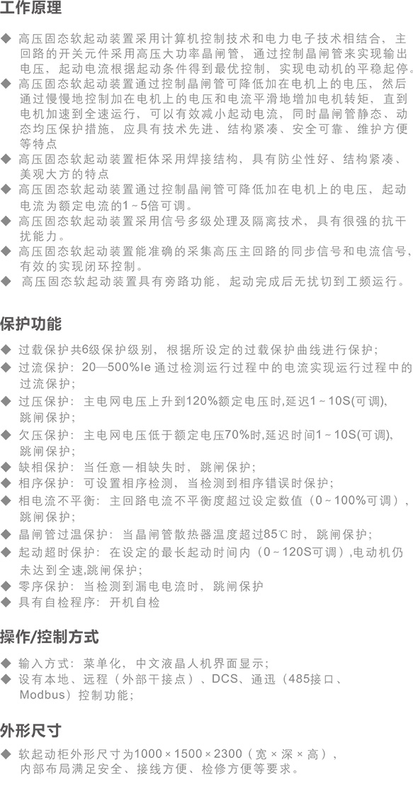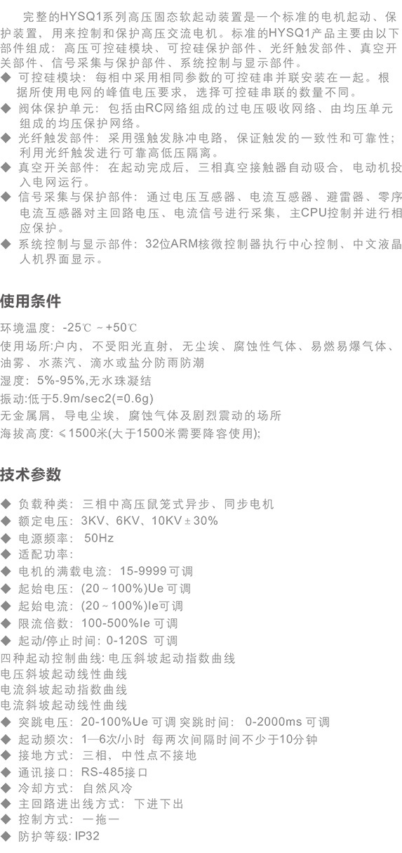 HYSQ1系列高壓固態(tài)軟啟動裝置具有體積小、功耗低、高可靠性、高靈敏度、無觸點、免維護、無環(huán)境污染、安裝方便等優(yōu)點。與其它傳統(tǒng)的起動方法相比較,其特有的智能控制方式,既可以方便準確的設置起動轉(zhuǎn)矩、起動電流、起動時間、停機時間等參數(shù),又可以與微機、PLC等進行聯(lián)網(wǎng)控制?,F(xiàn)已在機械制造、水泥生產(chǎn)、冶金、礦山、采油、化工、水處理、石化等行業(yè)泵、風機、抽油機、空氣壓縮機、球磨機、起重機、壓縮機、破碎機、傳送機、升降機、離心機、軋鋼機等多種負載上得到廣泛應用。