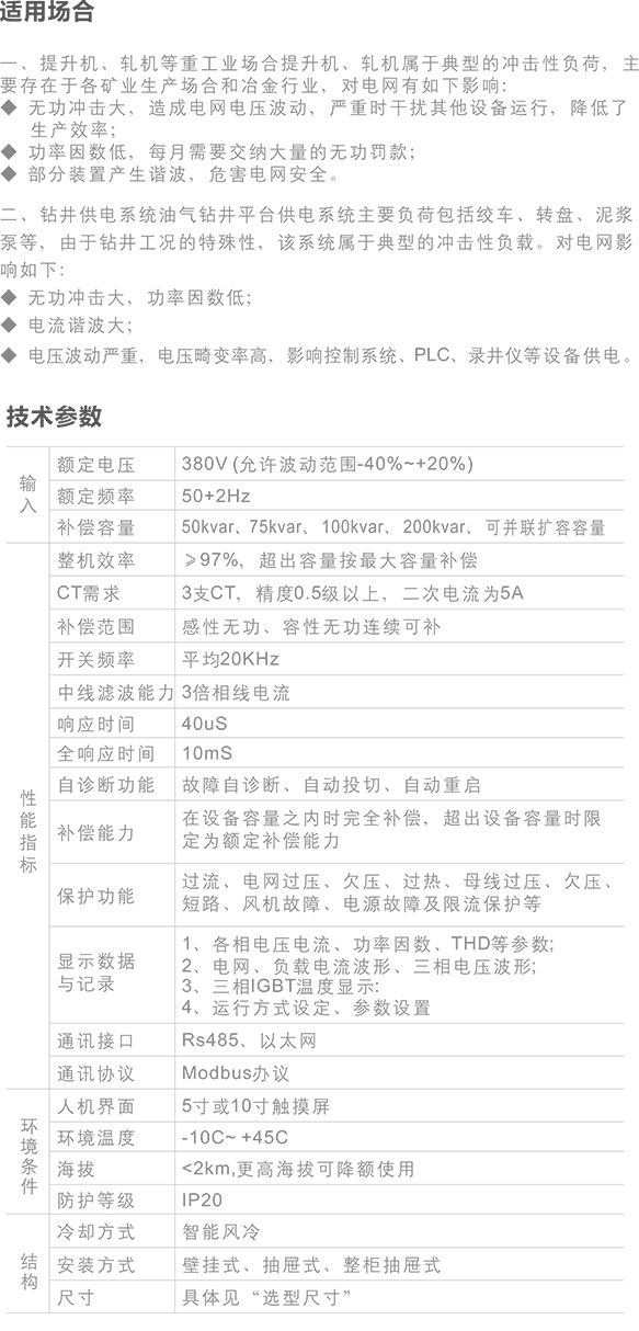 HYSVG靜止無功發生器(又稱SVG)的基本原理是將自換相橋式電 路通過電抗器直接并聯在電網上,適當地調節橋式電路交流側輸出電 壓的相位和幅值或者直接控制其交流側電流,就可以使該電路發出滿 足要求的無功電流,實現動態無功補償的目的。